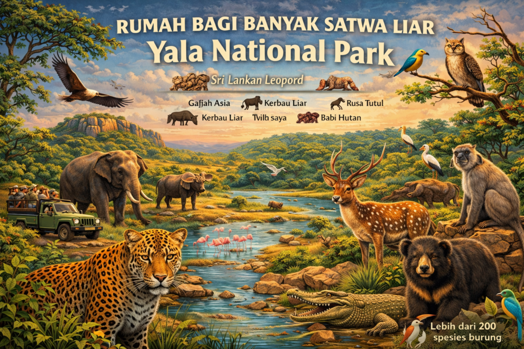 Safari di Yala memberikan kesempatan bagi wisatawan untuk melihat langsung berbagai hewan langka seperti macan tutul Sri Lanka, gajah, hingga ratusan spesies burung.